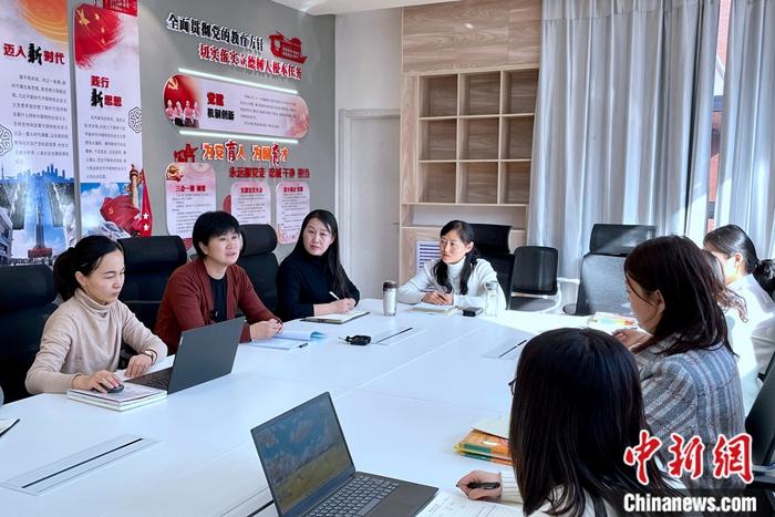 全國人大代表、寧夏銀川市二十一小學黨總支書記馬恒燕(左二)與銀川市二十一小學健康城分校教師交流。 李佩珊 攝