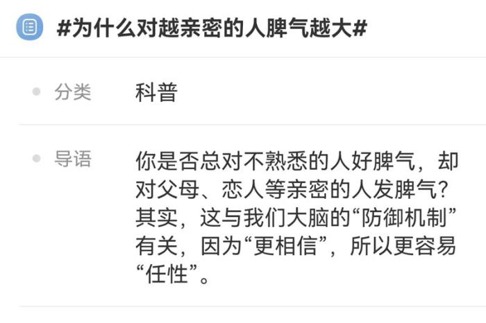 中新網客戶端北京6月22日電(記者 上官云)對陌生人和顏悅色,卻容易對親近的人心生不滿;明明是關心,話說出口卻成了指責……“為什么對越親密的人脾氣越大?”不久前,這個話題一度登上熱搜,很多人感嘆,自己也存在類似的問題。