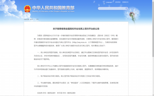 中國青年報客戶端北京7月6日電(中青報·中青網記者 葉雨婷)記者今天從教育部獲悉,為積極應對新冠肺炎疫情影響,優化高校畢業生求職就業服務流程,方便用人單位與畢業生網上簽約,教育部已開通全國高校畢業生畢業去向登記與網上簽約平臺(http://wq.ncss.cn,以下簡稱網簽平臺)。網上簽約電子就業協議書與紙質三方協議書效力相同。