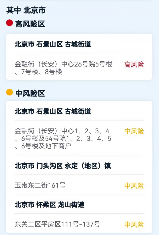 此前屬于高風險區的懷柔區東關二區平房區111號-137號調整為中風險區,懷柔區東關二區平房區其他區域和海淀區曙光街道魯園上河村三區1號樓3單元由中風險區調整為低風險區。