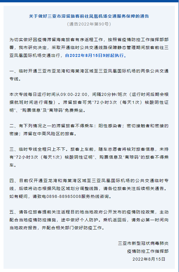 8月15日,海南三亞市新型冠狀病毒肺炎疫情防控工作指揮部發布通告,開通滯留旅客前往鳳凰機場公交專線,詳情如下: