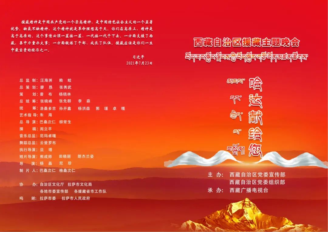 為展現(xiàn)援藏工作成就,弘揚(yáng)援藏精神,表達(dá)西藏各族干部群眾對(duì)習(xí)近平總書(shū)記和黨中央的親切關(guān)懷、全國(guó)人民無(wú)私支援特別是對(duì)援藏干部人才的敬意和感恩之情,由自治區(qū)黨委宣傳部、自治區(qū)黨委組織部共同主辦的援藏主題晚會(huì)《哈達(dá)獻(xiàn)給您》將于8月18日晚,在西藏衛(wèi)視(《西藏新聞聯(lián)播》后)、西藏藏語(yǔ)衛(wèi)視(19:30左右)播出,自治區(qū)七地市廣播電視臺(tái)將同步播出(地市《新聞聯(lián)播》后)。