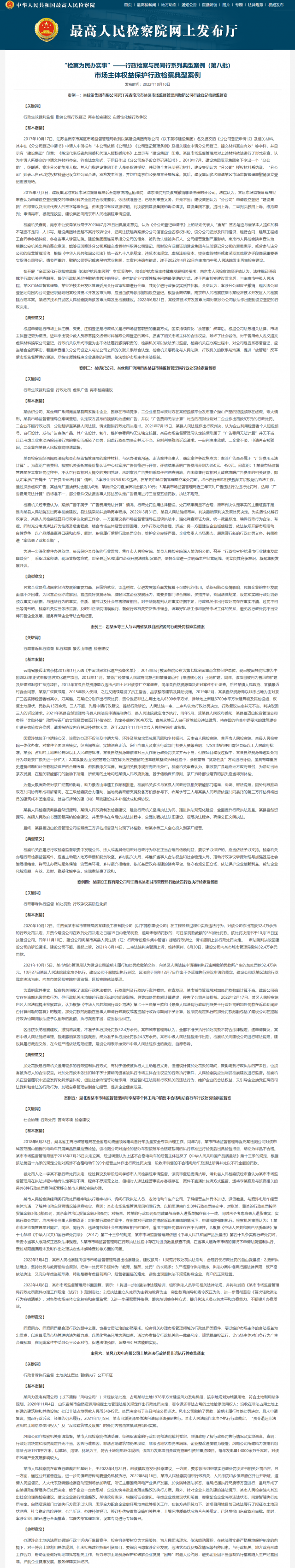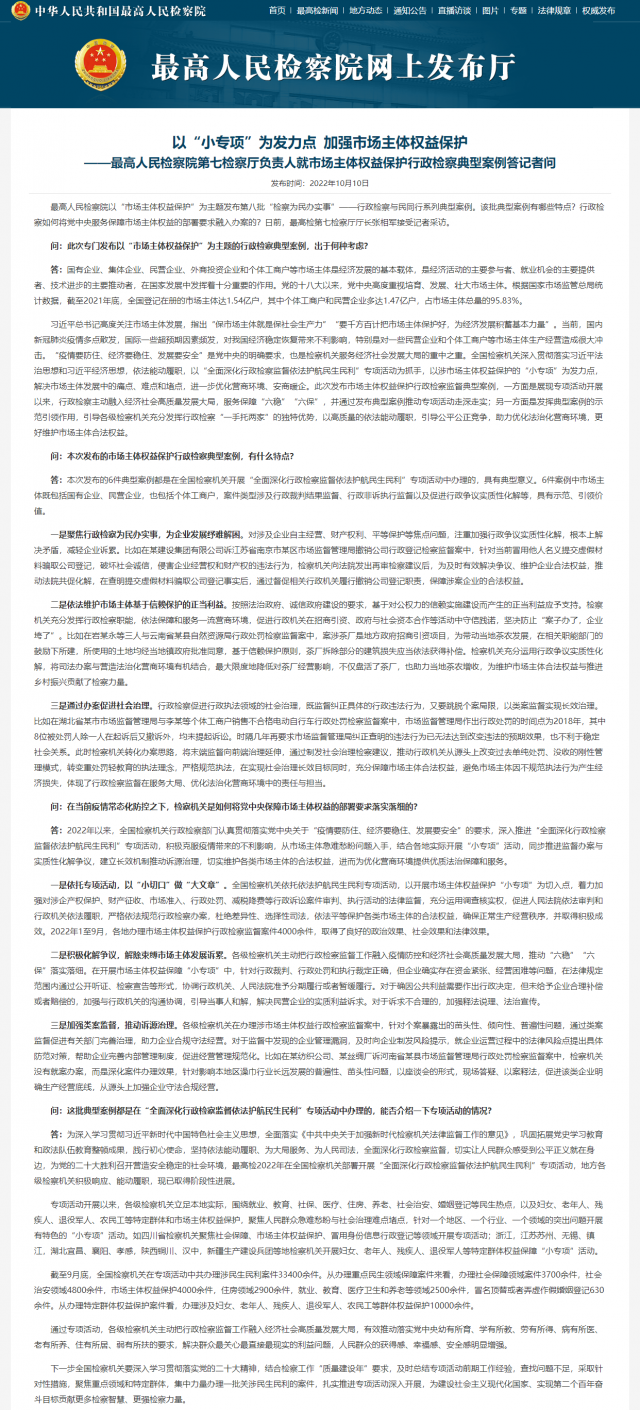 央視網消息:據中華人民共和國最高人民檢察院網站消息,10月10日,最高人民檢察院以“市場主體權益保護”為主題發布第八批“檢察為民辦實事”——行政檢察與民同行系列典型案例。