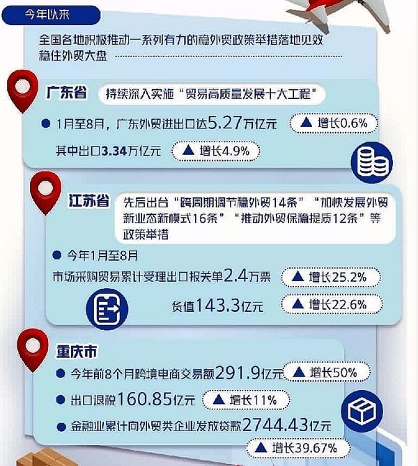 跨境電商等新業態也成為穩外貿的重要力量。今年,重慶成功舉辦了跨境電商交易會,積極推動跨境電商“保稅進口+零售分裝”業務試點,推廣“跨境電商+產業帶”模式,為外貿企業穩訂單、拓市場提供了新的解決方案。今年前8個月,重慶跨境電商交易額達291.9億元,增長50%。