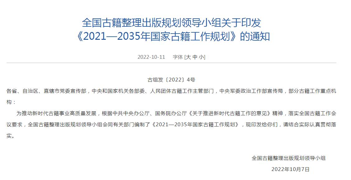 通知表示,要堅(jiān)持系統(tǒng)觀念,以重大工程為引領(lǐng),加強(qiáng)古籍工作全局性謀劃、戰(zhàn)略性布局和整體性推進(jìn)。強(qiáng)化重大工程牽引,建立古籍重大工程專項(xiàng)協(xié)調(diào)機(jī)制,統(tǒng)籌實(shí)施若干重大工程,加強(qiáng)古籍工作各領(lǐng)域各環(huán)節(jié)協(xié)同配合,帶動(dòng)重要古籍文獻(xiàn)系統(tǒng)性保護(hù)、整理、研究和出版。重點(diǎn)實(shí)施 《永樂大典》、敦煌文獻(xiàn)系統(tǒng)性保護(hù)整理出版工程,中華版本傳世工程 ( 古籍部分)和國家古籍?dāng)?shù)字化工程,充分發(fā)揮古籍在中華文明發(fā)展研究和新時(shí)代文化建設(shè)中的重要作用。