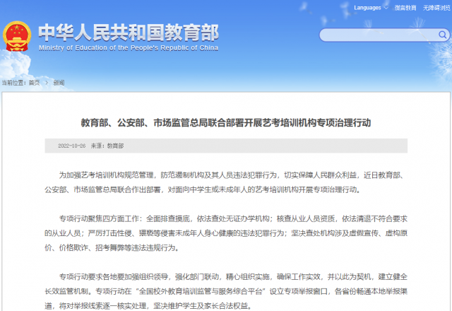 據(jù)教育部網(wǎng)站消息,為加強(qiáng)藝考培訓(xùn)機(jī)構(gòu)規(guī)范管理,防范遏制機(jī)構(gòu)及其人員違法犯罪行為,切實(shí)保障人民群眾利益,近日教育部、公安部、市場監(jiān)管總局聯(lián)合作出部署,對面向中學(xué)生或未成年人的藝考培訓(xùn)機(jī)構(gòu)開展專項(xiàng)治理行動。