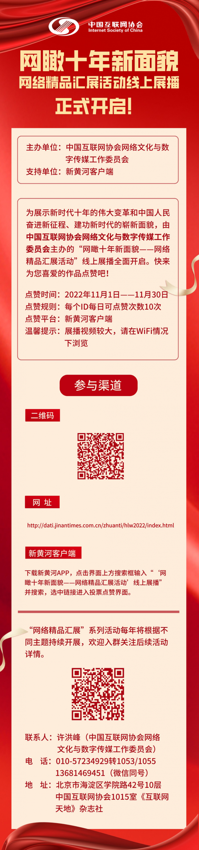 為展示新時代十年的偉大變革和中國人民奮進新征程、建功新時代的嶄新面貌,11月1日,由中國互聯網協會網絡文化與數字傳媒工作委員會(以下簡稱工作委員會)主辦的“網絡精品匯展”第三季“網瞰十年新面貌”網絡精品匯展活動線上展播啟動,在網絡空間唱響正能量。歡迎廣大網民點擊“閱讀原文”進入活動頁面為喜愛的作品點贊,展播時間截至11月30日。