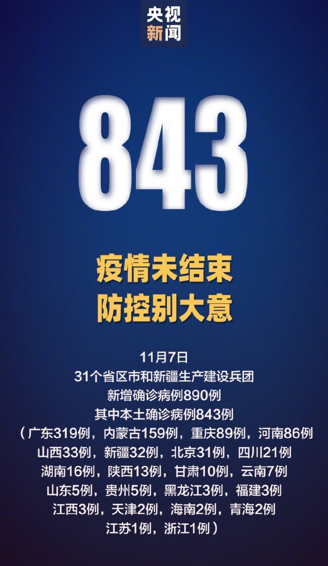 11月7日0—24時,31個省(自治區、直轄市)和新疆生產建設兵團報告新增確診病例890例。其中境外輸入病例47例(福建12例,廣東12例,四川8例,北京5例,天津3例,上海3例,遼寧2例,江蘇1例,山東1例),含2例由無癥狀感染者轉為確診病例(廣東1例,四川1例);本土病例843例(廣東319例,內蒙古159例,重慶89例,河南86例,山西33例,新疆32例,北京31例,四川21例,湖南16例,陜西13例,甘肅10例,云南7例,山東5例,貴州5例,黑龍江3例,福建3例,江西3例,天津2例,海南2例,青海2例,江蘇1例,浙江1例),含152例由無癥狀感染者轉為確診病例(廣東121例,甘肅9例,四川7例,北京3例,重慶3例,福建2例,湖南2例,陜西2例,山西1例,黑龍江1例,浙江1例)。無新增死亡病例。無新增疑似病例。