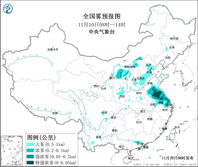 中央氣象臺今天早晨繼續發布大霧黃色預警:預計,11月10日早晨至上午,北京東部、天津、河北東北部和南部、山西東南部、山東西北部和南部、江蘇、安徽東部、上海、浙江北部以及陜西中北部、內蒙古河套地區等地的部分地區將有能見度不足1公里的大霧天氣,其中,天津南部、江蘇北部、安徽東北部、上海、浙江北部以及內蒙古河套地區等地的部分地區有能見度不足500米的濃霧,局地能見度不足50米。