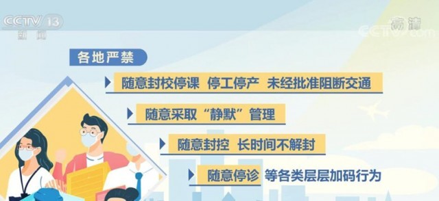 《通知》明確要求,各地嚴禁隨意封校停課、停工停產、未經批準阻斷交通,隨意采取“靜默”管理,隨意封控、長時間不解封,隨意停診等各類層層加碼行為,加大通報、公開曝光力度,對造成嚴重后果的依法依規嚴肅追責。對于沒有發生疫情的地區,要嚴格按照第九版防控方案確定的范圍對風險崗位、重點人員開展核酸檢測,既不能隨意擴大核酸檢測范圍,也不能隨意擴大人員管控、社區封控、隔離轉運范圍。糾正“一天兩檢”“一天三檢”等不科學做法。疫情發生地要分類有序做好外地滯留人員疏解,目的地不得拒絕接受滯留人員返回,既要避免疫情外溢,也不得加碼管控。