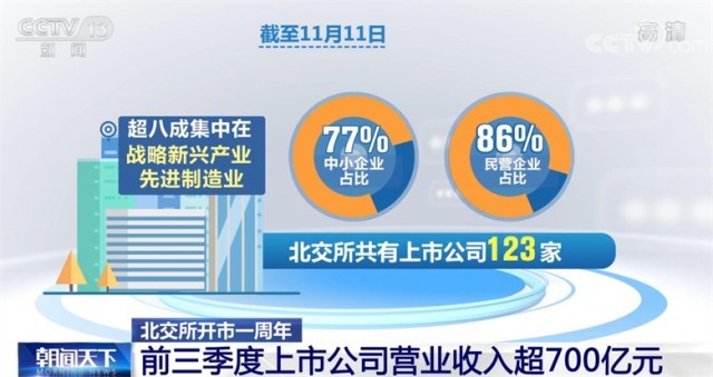 截至11月11日,北交所共有上市公司123家,其中,中小企業占比77%,民營企業占比86%,超八成集中在戰略新興產業、先進制造業;49家為國家級“專精特新”小巨人企業,平均研發強度達5.4%,高于社會平均水平,創新特征鮮明。