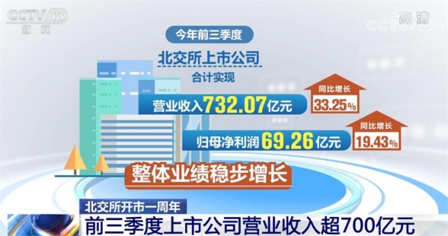 今年前三季度,北交所上市公司合計實現營業收入732.07億元,同比增長33.25%;實現歸母凈利潤69.26億元,同比增長19.43%,整體業績穩步增長。88家公司發布現金分紅方案,分紅公司家數占比超7成,合計分紅金額達23.61億元,惠及近80萬名投資者。