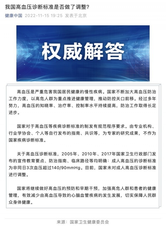 國家衛(wèi)健委:國家未對成人高血壓診斷標(biāo)準(zhǔn)進(jìn)行調(diào)整
