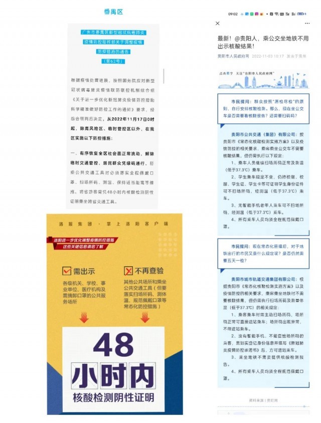最早宣布取消的是貴陽市。11月3日,“貴陽市人民政府網(wǎng)”發(fā)布《最新!@貴陽人,乘公交坐地鐵不用出示核酸結(jié)果!》,宣布根據(jù)貴陽市《常態(tài)化核酸檢測實(shí)施方案》以及疫情防控的相關(guān)要求,乘客乘坐公交車和地鐵時(shí)均不需要查驗(yàn)核酸檢測結(jié)果。