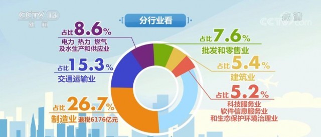數據顯示,分行業看,制造業是受益最明顯的行業,退稅6176億元,占比26.7%;交通運輸業占15.3%;電力、熱力、燃氣及水生產和供應業、批發和零售業、建筑業、科技服務業、軟件信息服務業和生態保護環境治理業占比從8.6%到5.2%不等。