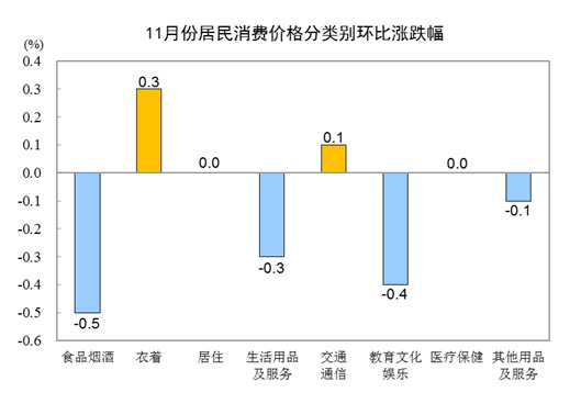 11月份,全國居民消費價格環比下降0.2%。其中,城市下降0.2%,農村下降0.2%;食品價格下降0.8%,非食品價格持平;消費品價格下降0.1%,服務價格下降0.2%。