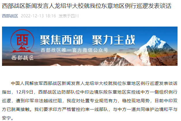 中國人民解放軍西部戰區新聞發言人龍紹華大校就我位東章地區例行巡邏發表談話指出,12月9日,西部戰區邊防部隊位中印邊境東段東章地區實控線中方一側組織例行巡邏,遭到印軍非法越線攔阻,我應對處置專業規范有力,穩控現地局勢,目前中印雙方已脫離接觸。我們要求印方嚴格管控約束一線部隊,與中方一道共同維護邊境和平與安寧。