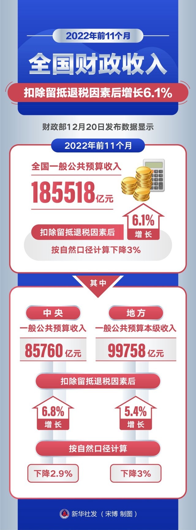 前11個月全國財政收入扣除留抵退稅因素后增長6.1%