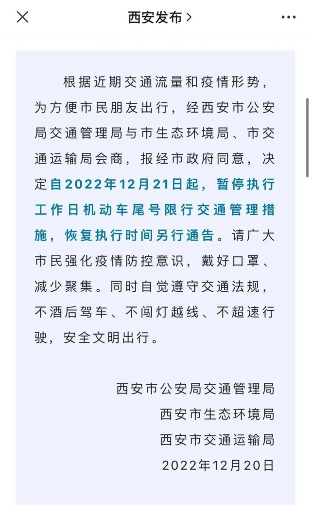 12月20日,陜西西安多部門發布通知,根據近期交通流量和疫情形勢,為方便市民朋友出行,決定自2022年12月21日起,暫停執行工作日機動車尾號限行交通管理措施,恢復執行時間另行通告。
