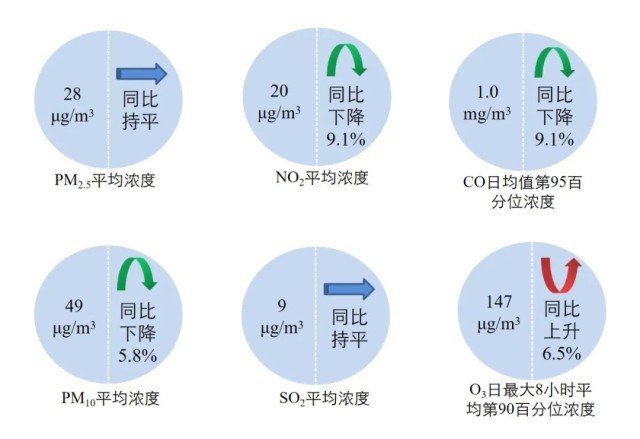 1—11月,全國339個地級及以上城市平均空氣質量優良天數比例為86.8%,同比下降0.8個百分點;PM2.5平均濃度為28微克/立方米,同比持平;PM10平均濃度為49微克/立方米,同比下降5.8%;O3平均濃度為147微克/立方米,同比上升6.5%;SO2平均濃度為9微克/立方米,同比持平;NO2平均濃度為20微克/立方米,同比下降9.1%;CO平均濃度為1.0毫克/立方米,同比下降9.1%。