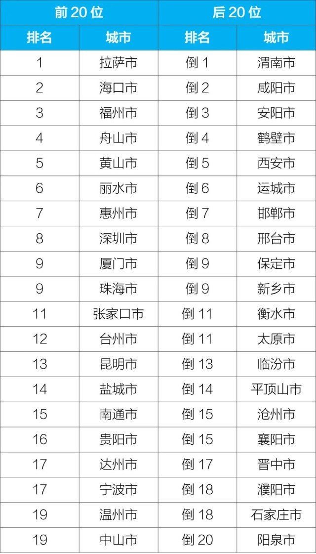 11月,168個重點城市中,拉薩、海口和福州市等城市空氣質量相對較好(從第1名至并列第19名);渭南、咸陽和安陽市等城市空氣質量相對較差(從倒數第1名至倒數第20名),見附表1。