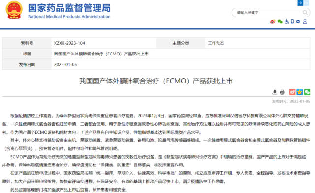國家藥監(jiān)局介紹,作為國產首個ECMO設備和耗材套包,上述產品具有自主知識產權,性能指標基本達到國際同類產品水平。
