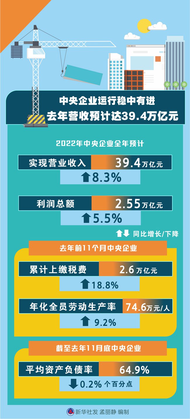 新華社北京1月5日電(記者王希)2022年,國資央企統籌疫情防控和企業生產經營,統籌發展和安全,推動經濟運行實現穩中有進,中央企業全年預計實現營業收入39.4萬億元、利潤總額2.55萬億元,同比分別增長8.3%和5.5%。
