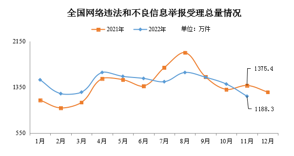 中央網信辦舉報中心近日公布的統計數據顯示,2022年11月,中央網信辦舉報中心指導全國各級網信舉報工作部門、主要網站平臺受理舉報1188.3萬件,環比下降15.1%、同比下降13.6%。