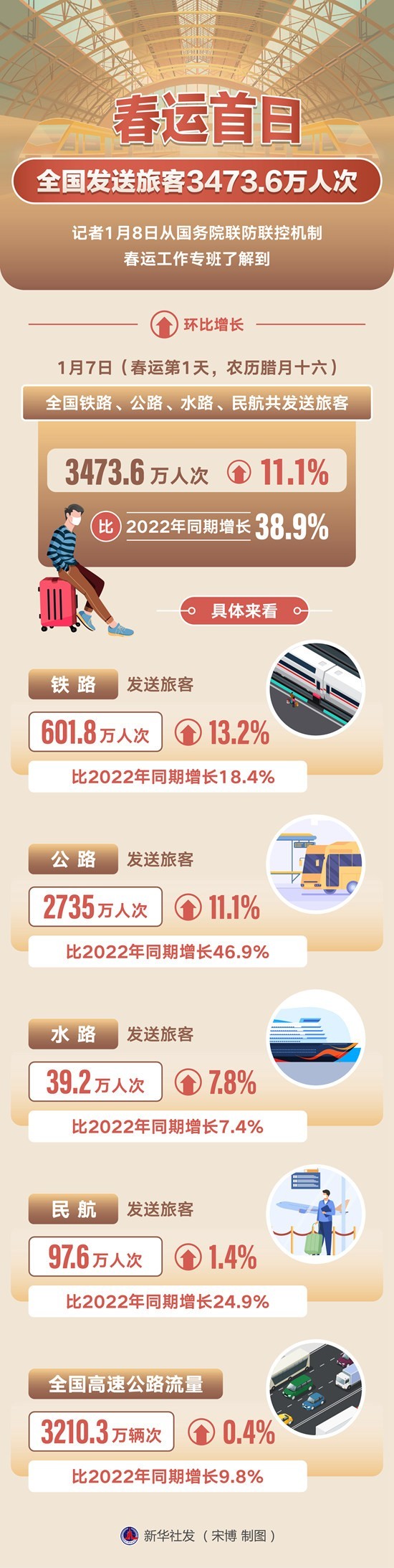 記者1月8日從國務院聯防聯控機制春運工作專班了解到,1月7日(春運第1天,農歷臘月十六)全國鐵路、公路、水路、民航共發送旅客3473.6萬人次,環比增長11.1%,比2022年同期增長38.9%。宋博/制圖(新華社發)