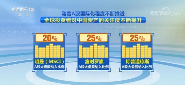 隨著A股國際化程度不斷推進,全球投資者對中國資產的關注度不斷提升。明晟(MSCI)、富時羅素和標普道瓊斯的A股大盤股納入比例已分別達到20%、25%和25%。