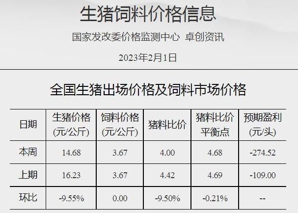 中新網2月6日電 據國家發改委價格監測中心網站消息,截至2023年2月1日當周,全國豬料比價為4.00,較春節前(1月18日)下降9.50%。按目前價格及成本推算,未來生豬養殖頭均虧損為274.52元。當周國內豬價以降為主。隨著春節假期收尾,終端消費漸顯疲軟,屠宰企業開工率低位調整,整體收購難度不大,壓價情緒較濃,而養殖端雖有抗價情緒,但生豬出欄壓力仍存,周內豬價小幅走低。