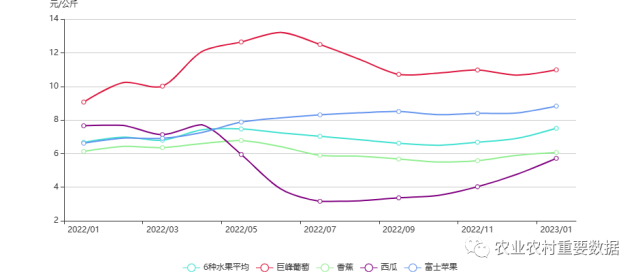 2023年1月,6種水果平均批發(fā)價格為7.51元/公斤,環(huán)比上漲8.68%,其中:巨峰葡萄、香蕉、西瓜和富士蘋果批發(fā)價格分別為10.99元/公斤、6.07元/公斤、5.72元/公斤、8.83元/公斤,比上月分別上漲2.90%、2.88%、19.92%、4.87%。