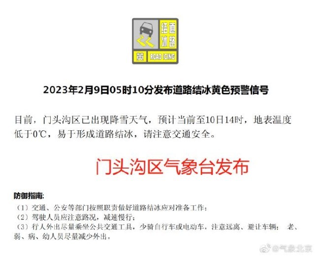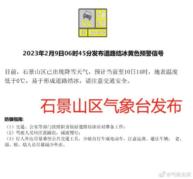 另外,目前石景山、門頭溝、延慶區氣象臺已發布道路結冰黃色預警信號,上述區域已出現降雪,易形成道路結冰,請大家出行注意交通安全。