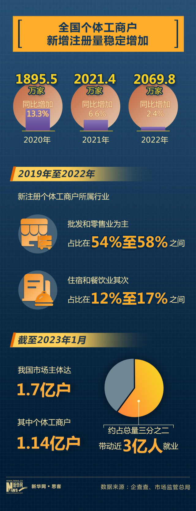 近日市場監管總局統計顯示,截至2023年1月,我國市場主體達1.7億戶,其中個體工商戶1.14億戶,約占總量三分之二,帶動近3億人就業。