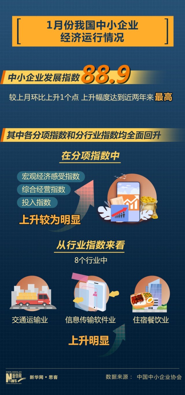 近日中國中小企業協會公布我國中小企業經濟運行情況。2023年1月份,中國中小企業發展指數為88.9,比去年12月回升1個點,上升幅度達到近兩年來最高。其中,企業發展信心回升,反映企業信心狀況的宏觀經濟感受指數為98.7,比上月上升2.1點。市場預期有所提振,市場指數為80.7,環比上升0.9點。