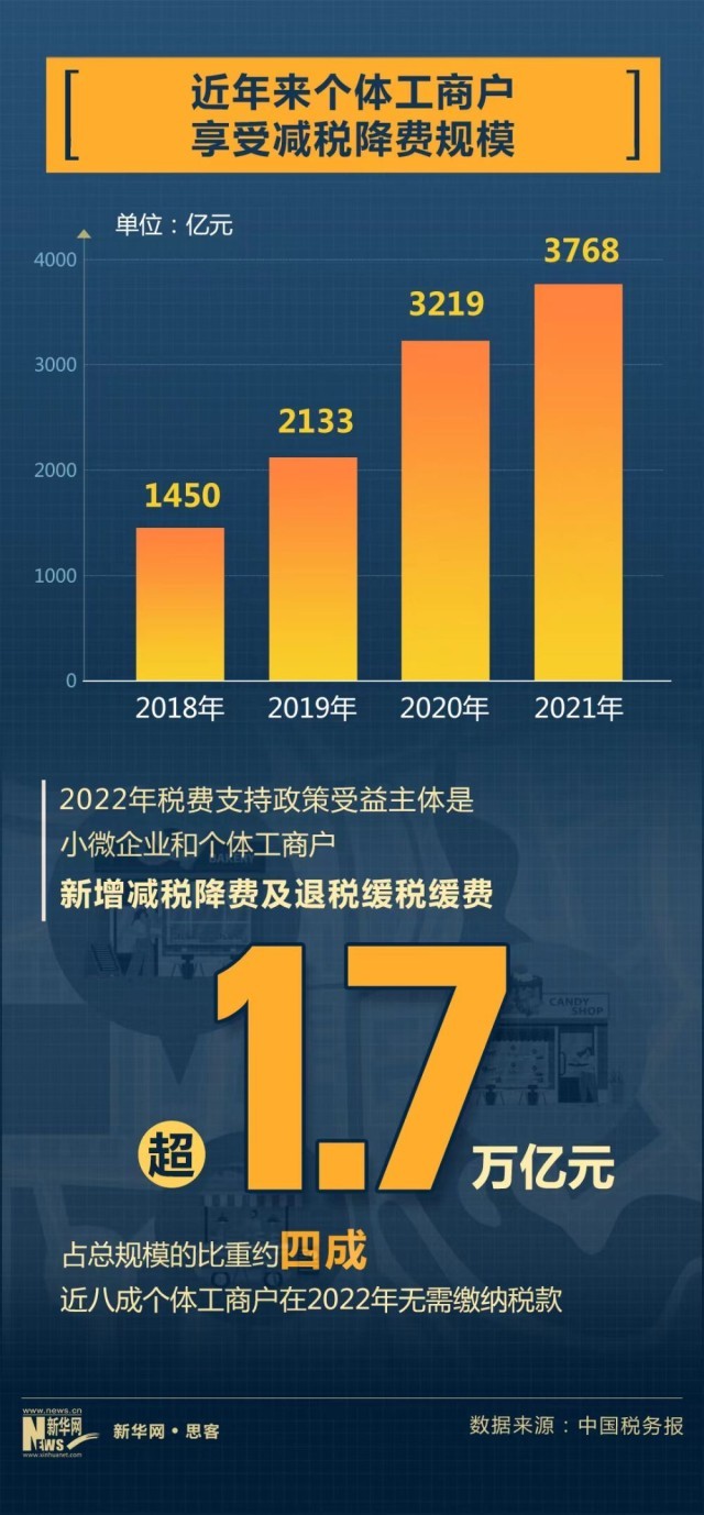 2021年,我國將包括個體工商戶在內的小規模納稅人增值稅免稅月銷售額從10萬元提高到15萬元,對個體工商戶應納稅所得額不超過100萬元的部分,在已有優惠政策的基礎上減半征收個人所得稅。