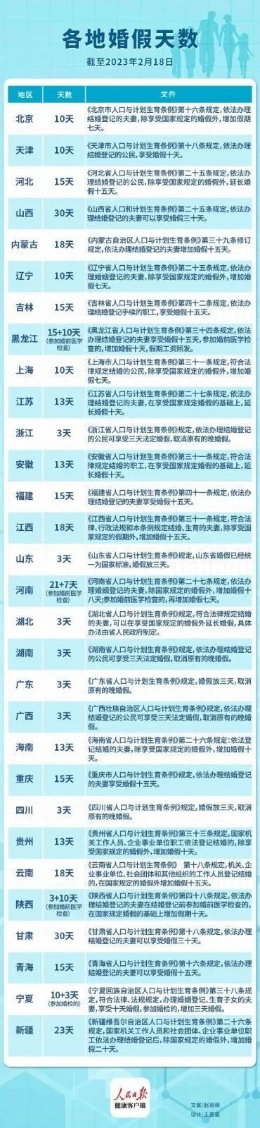 在一份全國(guó)各地婚假天數(shù)表中,具體的婚假天數(shù),各省的差距頗大。其中,浙江等省份只有3天。