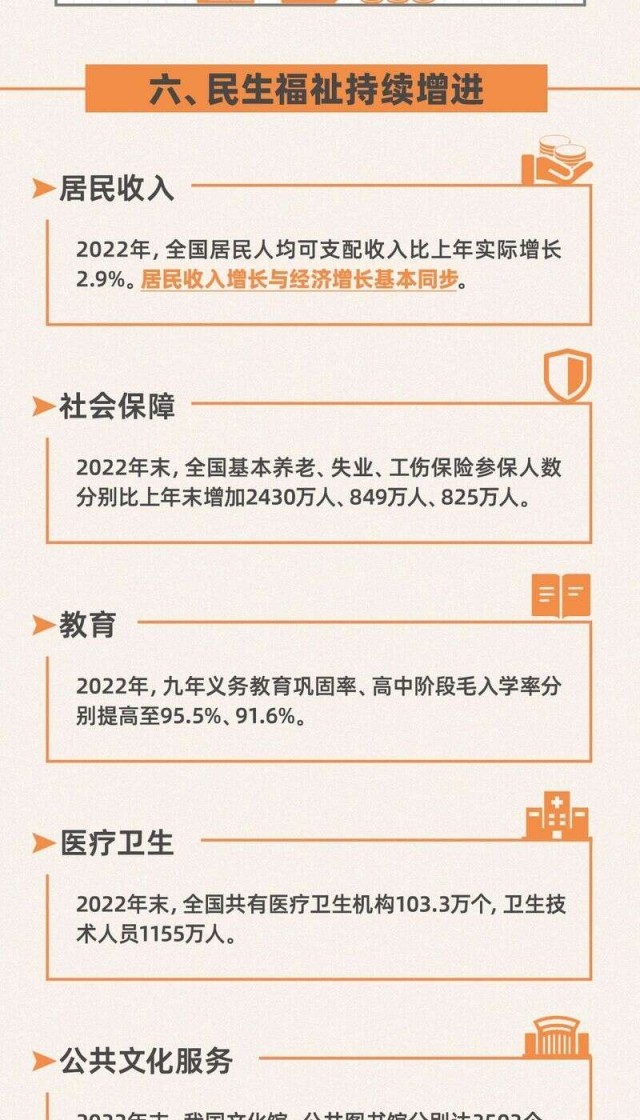 今日,國家統(tǒng)計局發(fā)布2022年國民經(jīng)濟(jì)和社會發(fā)展統(tǒng)計公報。初步核算,經(jīng)濟(jì)總量突破120萬億元,再上新臺階;全年糧食產(chǎn)量連續(xù)8年穩(wěn)定在1.3萬億斤以上;全部工業(yè)增加值首次超過40萬億元;全國城鎮(zhèn)新增就業(yè)1206萬人,超額完成年度目標(biāo)任務(wù);CPI月度漲幅始終低于3%;貨物進(jìn)出口總額首次突破40萬億元大關(guān);引資規(guī)模再創(chuàng)新高;全國居民人均可支配收入實(shí)際增長2.9%......轉(zhuǎn)存圖解,看看這些數(shù)字背后2022年的中國。