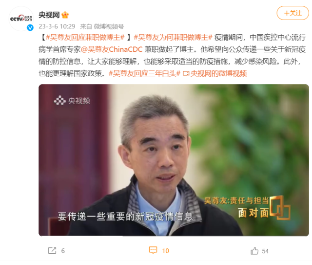疫情期間,吳尊友兼職做起了博主。他希望向公眾傳遞一些關(guān)于新冠疫情的防控信息,讓大家能夠理解,也能夠采取適當?shù)姆酪叽胧瑴p少感染風險。此外,也能更理解國家政策。