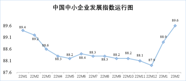 中國中小企業協會今天(10日)發布,2月份中小企業發展指數(SMEDI)為89.6,在上月大幅回升的基礎上,進一步回升0.7個點,連續兩個月上升且上升幅度達到兩年來次高,其中,分項指數和分行業指數均全面回升。8個行業中,社會服務業、信息傳輸計算機服務軟件業和住宿餐飲業指數上升明顯;分項指數中,效益指數、市場指數和綜合經營指數上升較為明顯。