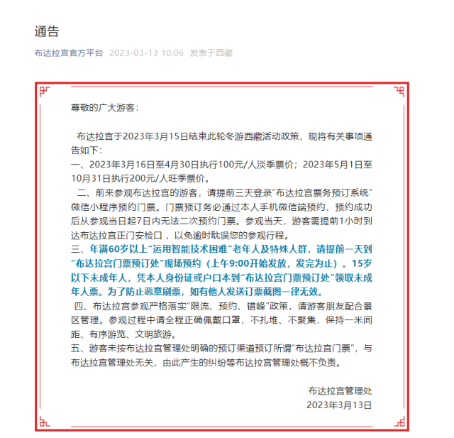 布達拉宮發布公告:3月16日起恢復淡季票價