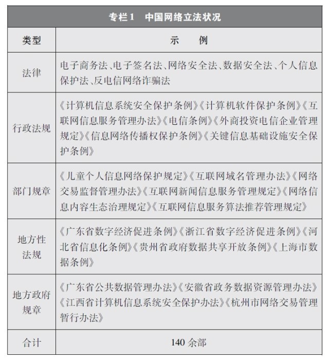 中國網絡立法隨著互聯網發展經歷了從無到有、從少到多、由點到面、由面到體的發展過程。第一階段從1994年至1999年,是接入互聯網階段。上網用戶和設備數量穩步增加。這一階段網絡立法主要聚焦于網絡基礎設施安全,即計算機系統安全和聯網安全。第二階段從2000年至2011年,是PC互聯網階段。隨著計算機數量逐步增加、上網資費逐步降低,用戶上網日益普遍,網絡信息服務迅猛發展。這一階段網絡立法轉向側重網絡服務管理和內容管理。第三階段從2012年至今,是移動互聯網階段。這一階段網絡立法逐步趨向全面涵蓋網絡信息服務、信息化發展、網絡安全保護等在內的網絡綜合治理。在這一進程中,中國制定出臺網絡領域立法140余部,基本形成了以憲法為根本,以法律、行政法規、部門規章和地方性法規、地方政府規章為依托,以傳統立法為基礎,以網絡內容建設與管理、網絡安全和信息化等網絡專門立法為主干的網絡法律體系,為網絡強國建設提供了堅實的制度保障。