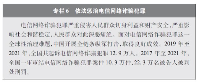 守護公民財產安全。持續加大立法保護力度,遏制利用網絡侵犯財產權益的行為。2018年出臺電子商務法,規定電子商務經營者銷售的商品或者提供的服務應當符合保障人身、財產安全的要求。民法典明確利用網絡侵害他人財產權益的行為應當承擔相應法律責任。2022年出臺反電信網絡詐騙法,為打擊電信網絡詐騙活動提供有力法律支撐,切實維護人民群眾的財產權益。