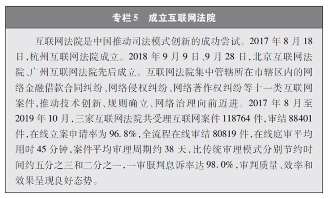 積極探索司法活動與網絡技術深度融合的新路徑、新領域、新模式,讓社會正義“提速”。積極推行大數據、云計算、人工智能、區塊鏈等現代科技在訴訟服務、審判執行、司法管理等領域的深度應用,先行先試構建中國特色的網絡司法模式。鼓勵各地法院因地制宜,結合當地互聯網產業發展情況和網絡糾紛特點,探索具有地域特色的新型互聯網審判機制。相繼設立杭州、北京、廣州互聯網法院,探索實行“網上案件網上審理”。大力推進數字檢察工作,堅持大數據賦能法律監督,系統整合各類辦案數據,積極探索構建大數據法律監督模型和平臺,努力推動個案辦理式監督和類案治理式監督相結合,為新時代法律監督提質增效。網絡司法的新模式標志著中國特色社會主義司法制度在網絡領域進一步發展完善,逐漸成為中國司法的一張亮麗名片。