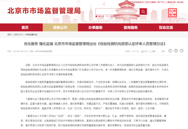 北京市市場監(jiān)督管理局出臺《檢驗檢測機構資質(zhì)認定評審人員管理辦法》