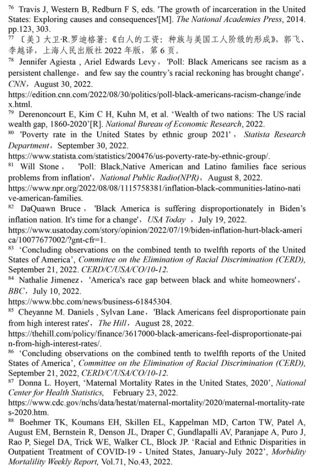 聯合國消除種族歧視委員會2022年9月21日發布的關于審議美國履行《消除一切形式種族歧視國際公約》情況的結論性報告指出,美國歷史上殖民主義和奴隸制留下的陰影至今仍揮之不去,助長著美國社會流行的種族主義。近幾年來,美國仇恨犯罪和仇恨言論事件顯著增加,與種族有關的槍支死傷人數大幅增加,有色人種和少數族裔在醫療、教育、住房等領域持續面臨系統性歧視。(注57)