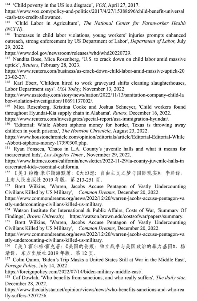 非法使用童工現象屢禁不止。根據非盈利組織“美國農場工人健康中心”的數據,美國有30萬至80萬名未成年人在農場工作。(注145)美國《石板》網絡雜志指出,美國很多快餐店違反保護兒童健康與教育的規定,雇用青少年超時工作。童工問題屢禁不止,根源是美國法律體系存在漏洞。受新冠疫情和供應鏈危機影響,美國多地出現“用工荒”現象,多州批準新法案延長未成年人工作時間。根據美國勞工部的數據,2022年,美國有數百萬青少年受雇在農業、食品服務、零售、娛樂和建筑行業工作。(注146)路透社2023年2月28日報道,美國非法雇傭童工問題日益嚴重,自2018年以來,被非法雇用的童工激增了近70%。根據美國勞工部的數據,2022財年有835家企業違法雇用3800名兒童,受雇專門從事危險工作的兒童增加了26%。(注147)《今日美國報》2022年11月13日報道,威斯康星州帕克斯清潔服務公司雇用了30多名13至17歲的未成年人在肉類加工廠和農場擔任清潔工。幾名未成年雇員在工作中受傷,其中一名13歲兒童被腐蝕性清潔化學品燒傷。(注148)路透社2022年12月16日報道,在阿拉巴馬州至少有四家汽車零部件供應商被發現雇傭童工,勞務派遣機構將未成年人移民安置在工廠工作。(注149)時至今日,美國仍是聯合國193個會員國中唯一沒有批準《兒童權利公約》的國家,解決雇傭童工問題的前景依然黯淡。