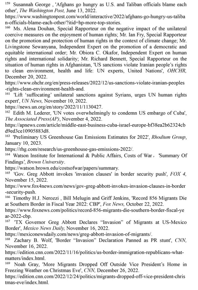 長期肆意實施單邊制裁。近年來,美國對其他國家實施的單邊制裁呈指數級增長,極大削弱了被制裁國家人權保障的能力與水平。孟加拉國《每日星報》2022年12月28日報道,美國實施的單邊制裁總數為世界之最,目前仍在對20多個國家實施制裁,包括1962年以來對古巴的制裁、1979年以來對伊朗的制裁、2011年以來對敘利亞的制裁,以及近年來對阿富汗的制裁,導致被制裁國家無法向其人民提供基本的食物和藥品。(注158)《華盛頓郵報》2022年6月13日報道,近一半的阿富汗人沒有足夠的食物,兒童營養不良呈上升趨勢。(注159)2022年12月20日,多名聯合國人權理事會獨立專家發表共同聲明指出,美國政府對伊朗的制裁加劇了伊朗的環境危害,使所有在伊朗的民眾無法充分享受健康權和生命權,侵犯了伊朗人民享有清潔環境的權利。(注160)聯合國單邊強制措施對人權負面影響問題特別報告員阿萊娜·杜晗2022年11月10日指出,單邊制裁加劇了敘利亞人民的苦難,是對人權的嚴重侵犯。(注161)美國政府肆意實施制裁引發他國人權危機受到國際社會強烈譴責。2022年11月3日,聯合國大會就敦促美國終止對古巴的經濟、商業和金融封鎖進行投票表決。在193個成員國中,多達185個國家支持譴責美國對古巴的禁運。(注162)這是聯合國大會連續30次通過類似決議。