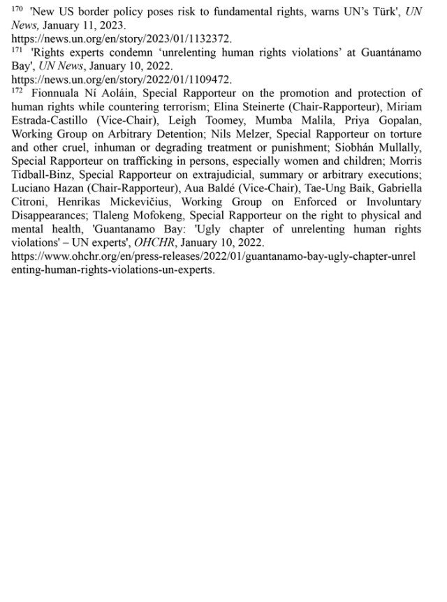 拒不關閉關塔那摩監獄。2002年設立的關塔那摩監獄最多時曾關押約780人,其中大多數人未經審判便遭拘留,受到了殘忍的、不人道的待遇,是美國“肆意侵犯人權的一個丑陋篇章”。(注171)聯合國人權理事會在反恐中促進和保障人權問題特別報告員菲奧努阿拉·尼奧萊因等多名獨立專家2022年1月發表共同聲明指出,臭名昭著的關塔那摩監獄是美國在人權保護上的污點,要求美國政府關閉關塔那摩監獄,對遭受酷刑、任意拘留的公民進行賠償,并根據國際法追究授權和實施酷刑的人員的責任。(注172)