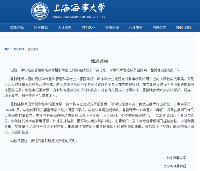 央視網(wǎng)消息:4月10日,上海海事大學(xué)在官網(wǎng)發(fā)布情況通報(bào)稱,近期,學(xué)校經(jīng)濟(jì)管理學(xué)院教師瞿群臻通過(guò)網(wǎng)絡(luò)連續(xù)散布不實(shí)信息,對(duì)學(xué)校聲譽(yù)造成負(fù)面影響。瞿群臻所舉報(bào)的經(jīng)濟(jì)學(xué)專業(yè)和管理科學(xué)專業(yè)申報(bào)國(guó)家級(jí)一流本科專業(yè)建設(shè)點(diǎn)材料中涉及的兩個(gè)上海市級(jí)教學(xué)成果獎(jiǎng),分別由九位教師和五位教師合作完成,是由這些包括經(jīng)濟(jì)學(xué)專業(yè)和管理科學(xué)專業(yè)在內(nèi)的教師們,在專業(yè)建設(shè)過(guò)程中共同取得的職務(wù)性團(tuán)隊(duì)成果。學(xué)校申報(bào)國(guó)家級(jí)一流本科專業(yè)建設(shè)點(diǎn)的材料真實(shí),符合有關(guān)規(guī)定。近兩年來(lái),瞿群臻曾就此事多次舉報(bào),經(jīng)查,均不屬實(shí),相關(guān)情況已反饋其本人。